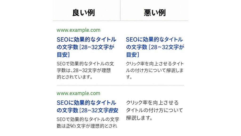 内容に合っていない「釣りタイトル」や、キーワードを必要以上に詰め込むのは逆効果です。また、装飾や感情的な表現を使いすぎると、記事の専門性や信頼性が下がるので注意しましょう。
